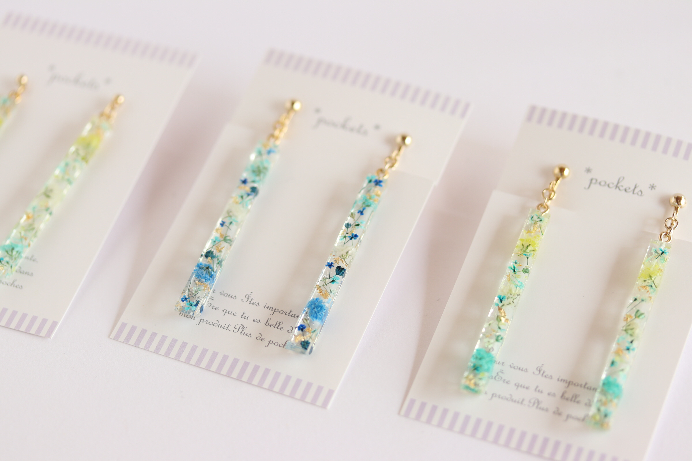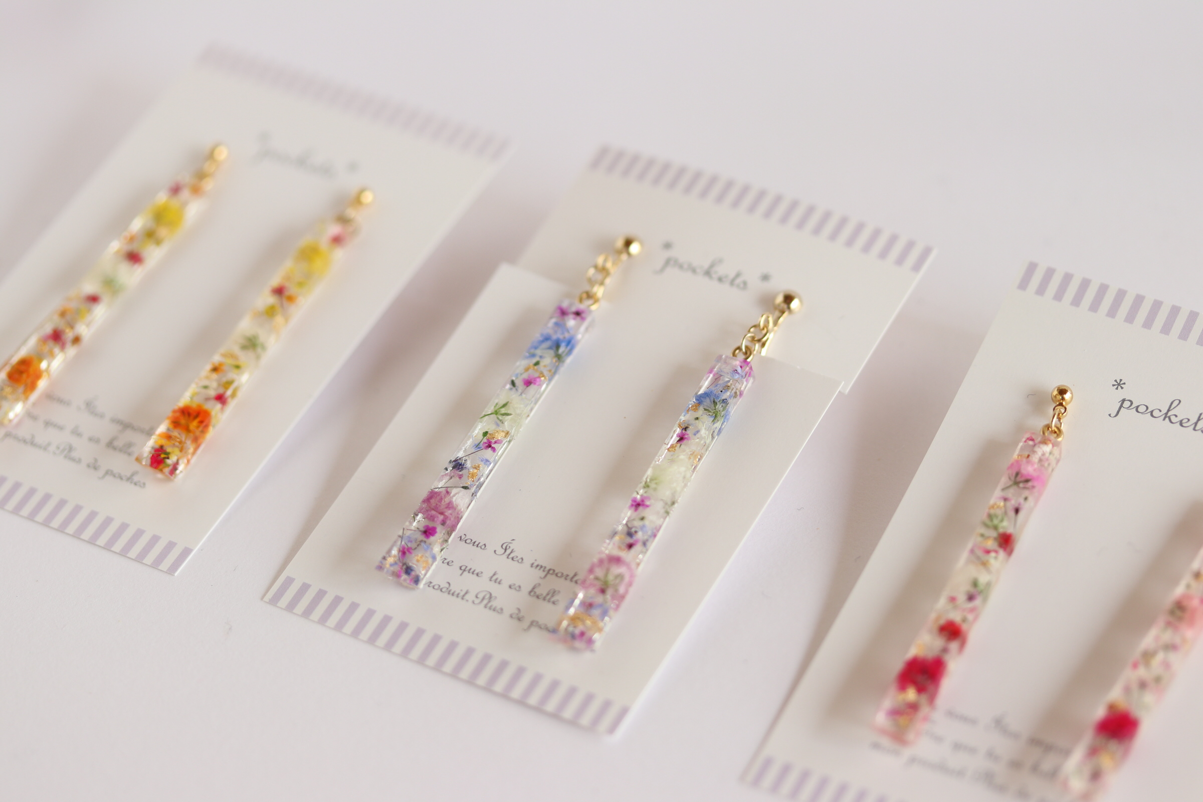 - ハンドメイドジャパンに出展予定の作品です。pocketsもハンドメイドジャパンは初参加となりますので頑張って多くの作品をお持ちして頑張りますね。人気のお花のレジンアクセサリーやスワロフスキーを使ったピアス・イヤリングを中心に展示販売してまいります。
