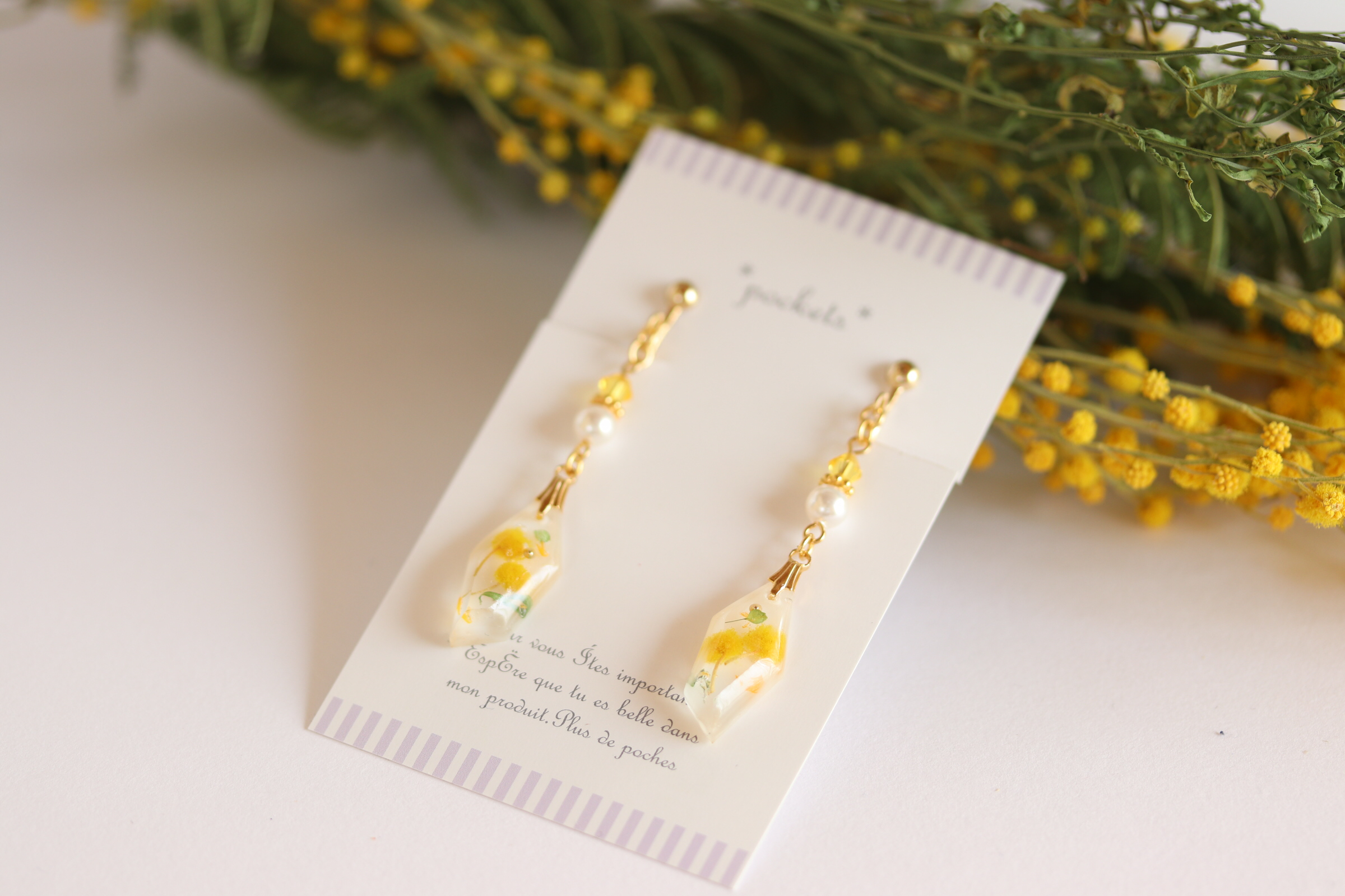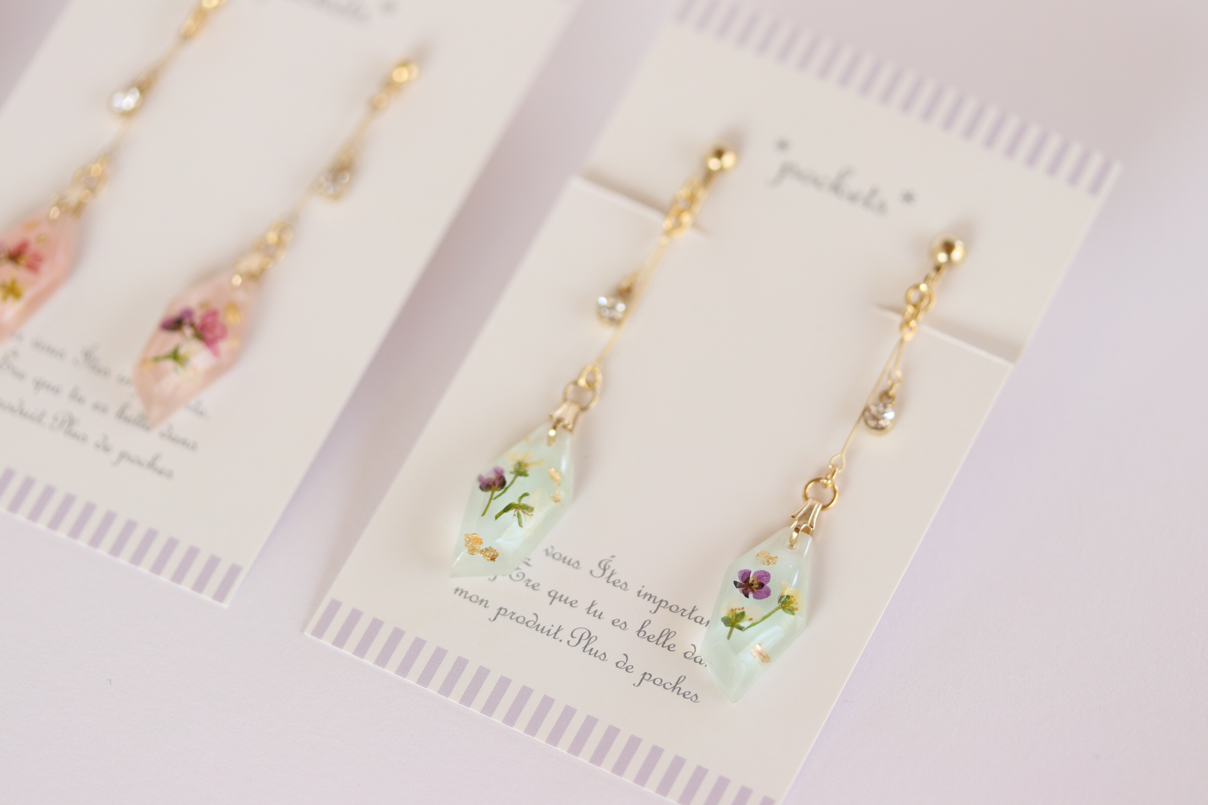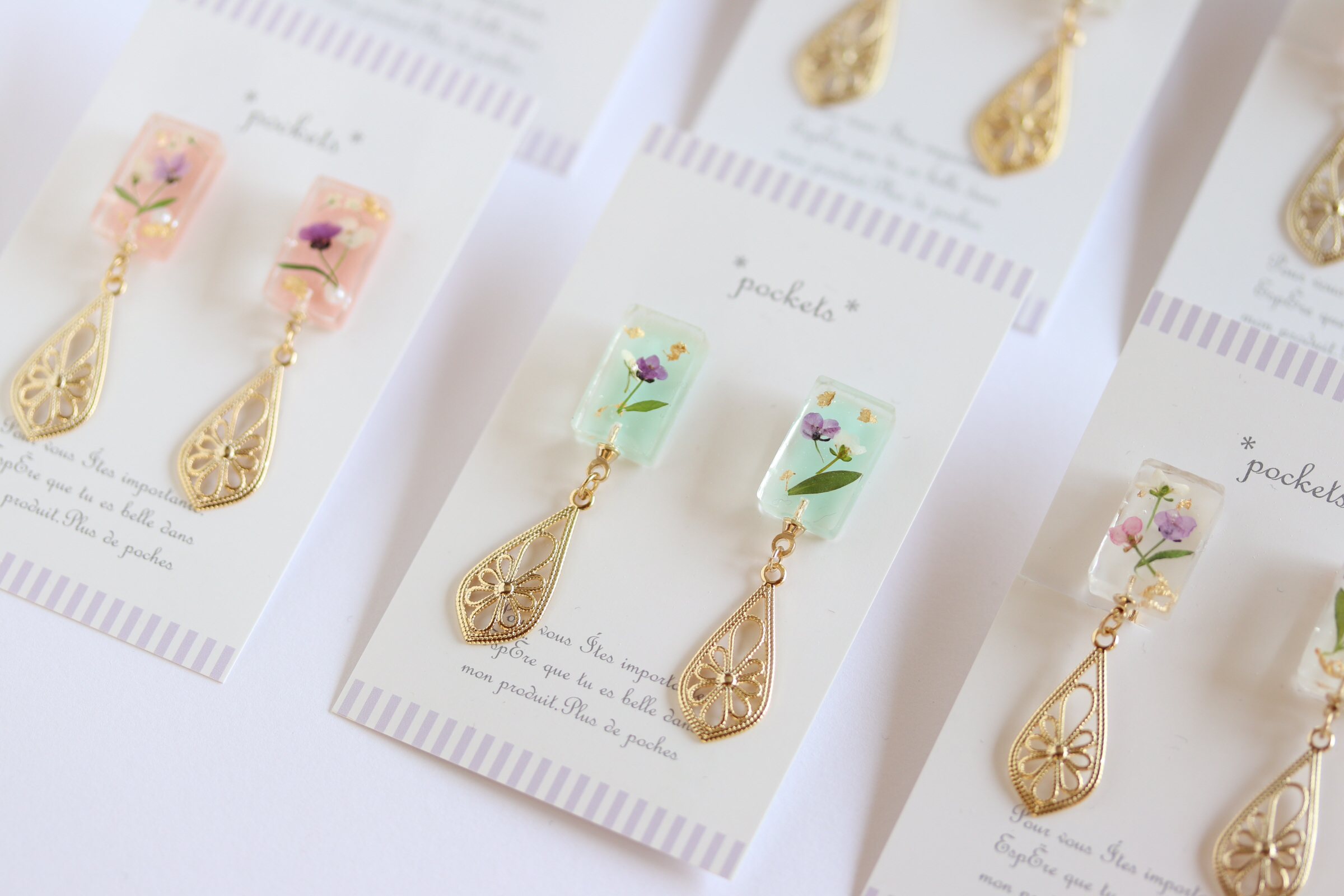 - ハンドメイドアクセサリー「pockets」。お客様の「ハート型の花のレジンアクセサリーが欲しい」というお気持ちを作品にしました。委託販売は東京都世田谷区三軒茶屋「Lupopo」様、京都市右京区「yoo」様、大阪府北区「hakomitsu」様にて販売しております。